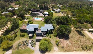 En venta: propiedad de lujo en La BarraUbicada en el punto más alto de La Barra, a solo 700 metros del mar, esta exclusiva propiedad ofrece vistas únicas a Punta del Este y la Isla de Lobos. Situada en un terreno de 5.000 m² con 800 m² construidos, combina elegancia, funcionalidad y contacto con la naturaleza.CASA PRINCIPALEsta residencia de tres niveles se destaca por su diseño luminoso, cálido y con detalles de alta calidad:•Planta Baja:oEntrada para autos y un hall de recepción imponente.oToilette, living con chimenea, comedor para 12 personas y cielorrasos de más de 3 metros de altura.oCocina con isla central totalmente equipada, comedor diario y playroom semi-integrados.oLavadero y dependencia de servicio completa.oDos dormitorios con cama queen, acceso exterior, salamandra y baño compartido.oDos galerías techadas: una con sofás y mesas bajas; otra con mesa alta y sillas. Deck con fuente de agua y área de descanso equipada con sillones y mesa baja.•Planta Alta:oEscalera principal que conduce al dormitorio principal en suite (cama king), con chimenea, vestidor, baño amplio y terraza privada con parrillero propio. La terraza incluye una mesa para 12 personas, reposeras y vistas inigualables a la Isla de Lobos y Punta del Este.oOtra escalera que conecta dos dormitorios adicionales con cama queen, salamandra, balcón compartido y baño completo.oDormitorio adicional en suite (cama queen) con vestidor, baño, balcón y terraza privada con sillones.•Subsuelo:oGaraje cerrado para dos autos con portón eléctrico, área de depósito y sala de máquinas.oSistema de agua caliente por energía solar con respaldo a gas.oCalefacción por radiadores, tanque de agua de 5.000 litros y perforación para riego automático.Casa de Huéspedes o CaserosUna construcción independiente diseñada para la privacidad y comodidad:•Dos dormitorios, baño, living-comedor-cocina con salamandra y balcón.•Garaje para dos autos con portón eléctrico, además de una cochera exterior cubierta para un vehículo adicional.Club Parrilla Exterior y GarajeEl club parrilla, con 200 m² de superficie, se ha diseñado pensando en el entretenimiento y la funcionalidad:•Parrillero techado con cerramiento enrollable transparente, equipado con parrilla, plancha a gas, heladera, bar con banquetas, pileta de lavado y espacio de trabajo.•Comedor con capacidad para 18 personas, que incluye mesas, sillas y bancos.•Espacio adicional para un fogón y baño exterior de diseño rústico, abierto al cielo.•Garaje integrado con capacidad para 6 vehículos y un autoelevador, ideal para coleccionistas o amantes de los autos.Exterior y JardinesLa propiedad ofrece una amplia variedad de espacios exteriores para disfrutar:•Piscina de 15x7 metros con trampolín, rodeada por un deck con reposeras, sombrillones y mesas.•Jardines autóctonos con huerta, frutales, comederos y casitas para aves.•Sistema de riego por perforación y tanque de agua independiente.Esta propiedad única combina lujo, confort y un entorno natural excepcional, ideal para disfrutar durante todo el año. ¡Una oportunidad que no puedes dejar pasar!